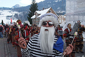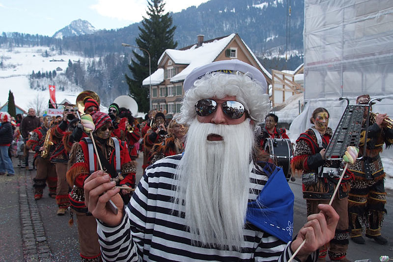 Aber auch alle möglichen anderen Reisevarianten waren zu bewundern. Vom Planwagen bis zum Segelschiff war alles dabei. Und natürlich durfte auch ein Flugzeug nicht fehlen. Hier gab es direkt noch First Class-Tickets zu ergattern, die direkt von neu St. Johann nach Mexiko durchstarteten. Musikalisch begleitet wurde die Weltreise von den Städtli-Schränzern aus Lichtensteig und den Obertoggenbuger Lutere Guggern.